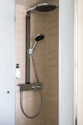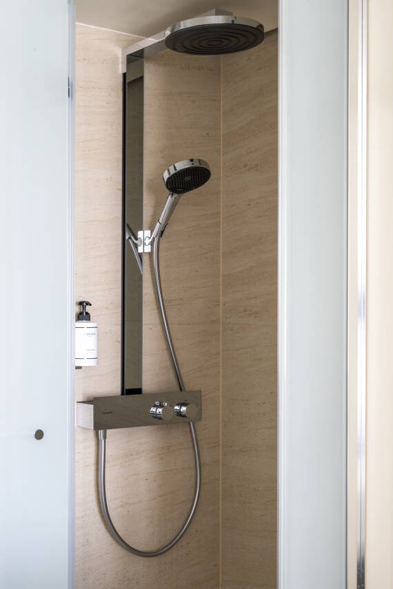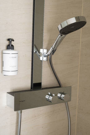 Voor The Hotel werden er zo’n 200 Rainfinity EcoSmart Showerpipes op maat geproduceerd. Voor projecten van meer dan 30 stuks is dit een service die Hansgrohe op vraag kan verwezenlijken. Voor dit hotel werd de originele hoofddouche vervangen door een Pulsify S 260 EcoSmart. Zo is de thermostaat voorzien van een handig tablet en de CoolContact technologie, waardoor de buitenkant altijd aangenaam koel blijft. Dit maakt douchen veiliger, zodat gezinnen met kinderen ook een aangename hotelervaring beleven zonder zorgen. Dankzij de regelknop op de thermostaat kan de waterstroom nauwkeurig worden aangepast, wat zorgt voor een bewuste en efficiënte omgang met water.
